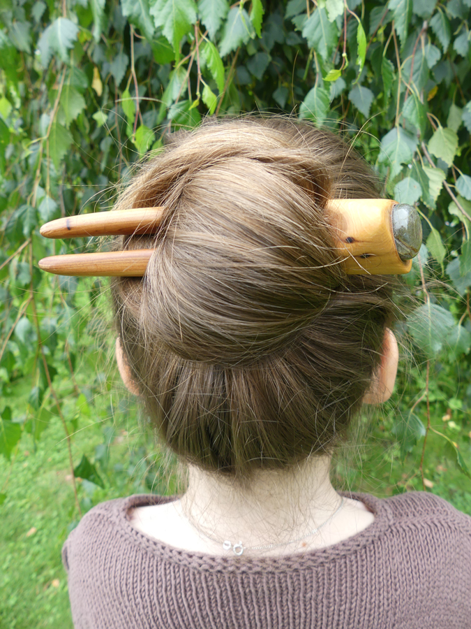 Um lange Haare besonders bruchschonend hochzustecken, sind traditionelle Haarstäbe und Forken bis heute die beste Wahl. Aus hübschen Hölzern, kombiniert mit Edelsteinen ergibt sich das für meinen Geschmack perfekte Utensil um die wilde Mähne zeitweise zu bändigen. Zu beachten ist lediglich die Länge und Dicke des Stabes, die grob auf die persönliche Haarlänge- und dicke abgestimmt sein sollte.