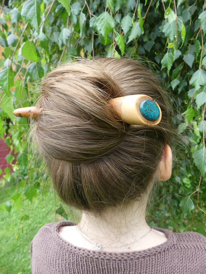Um lange Haare besonders bruchschonend hochzustecken, sind traditionelle Haarstäbe und Forken bis heute die beste Wahl. Aus hübschen Hölzern, kombiniert mit Edelsteinen ergibt sich das für meinen Geschmack perfekte Utensil um die wilde Mähne zeitweise zu bändigen. Zu beachten ist lediglich die Länge und Dicke des Stabes, die grob auf die persönliche Haarlänge- und dicke abgestimmt sein sollte.