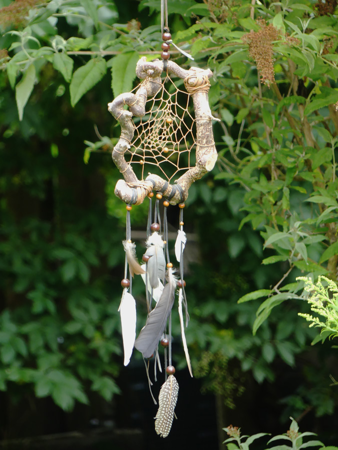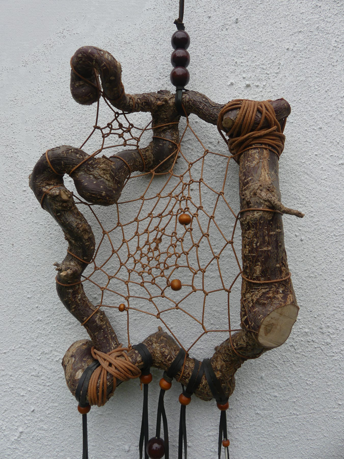 Wurzelfundholz, versch. Federn und Lederband, Durchmesser: 23x16 cm